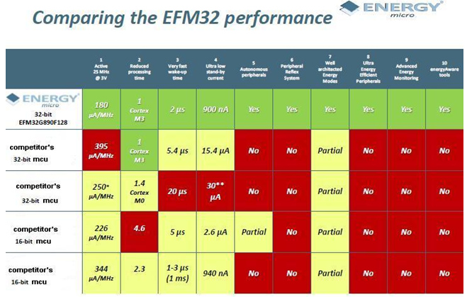 圍繞節(jié)能的ARM ® Cortex™- M3處理器架構(gòu),Giant Gecko, Gecko 和Tiny Gecko微控制器的使用證明它們可比8 - ,16 - 或32位微控制器節(jié)能四分之一。 這些微控制器具有僅為2μs的喚醒時(shí)間和MHz執(zhí)行代碼下每閃存 180μA的電流消耗,深度睡眠模式下為900nA, 關(guān)閉模式下為20nA, 這些微控制器被證明有能力延長300%的標(biāo)準(zhǔn)電池壽命。[page]