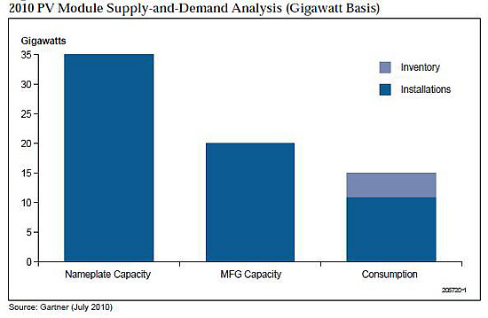 據(jù)市場(chǎng)調(diào)研公司Gartner表示,光伏組件制造商所聲稱的”售罄”情形及生產(chǎn)設(shè)備滿負(fù)荷運(yùn)轉(zhuǎn)的情形,與光伏組件實(shí)際的生產(chǎn)供應(yīng)情況極為不符。Gartner表示,光伏組件的實(shí)際生產(chǎn)供應(yīng)量約為20GW至24GW,而2010年預(yù)計(jì)新增安裝量?jī)H為11GW多一點(diǎn)。由于兩個(gè)數(shù)據(jù)并不相互吻合,因此,Gartner擔(dān)憂市場(chǎng)將無(wú)法達(dá)到供需平衡。
