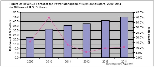 從2009年到2014年,功率MOSFET的復(fù)合年度增長(zhǎng)率將為20.8%,高于任何類型的電源管理半導(dǎo)體,不論是分立還是集成類型。