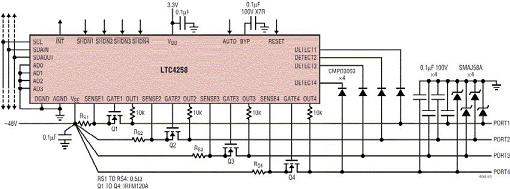 圖1a:采用LTC4258實(shí)現(xiàn)的符合基本802.3af標(biāo)準(zhǔn)的PSE電路