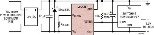 圖1b:采用LTC4257實(shí)現(xiàn)的符合基本802.3af標(biāo)準(zhǔn)的PD電路。