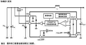 通過外接P溝道功率MOSFET或PNP晶體管、線圈、電容器和二極管,可以構(gòu)成降壓型DC/DC控制器,該產(chǎn)品適用于移動設(shè)備的電源。主要指標(biāo):輸入電壓為2.5?16V,輸出電壓為1.5?6.0V,可以0.1V為進(jìn)階單位來進(jìn)行設(shè)定;低消耗電流工作時(shí):60μA最大值(A、B型產(chǎn)品);休眠時(shí):0.5μA最大值。振蕩頻率典型值為180kHz(A、B型產(chǎn)品);軟啟動功能典型值為8ms(A、B型產(chǎn)品);備有開/關(guān)控制功能。圖2為S-8251基本電路。