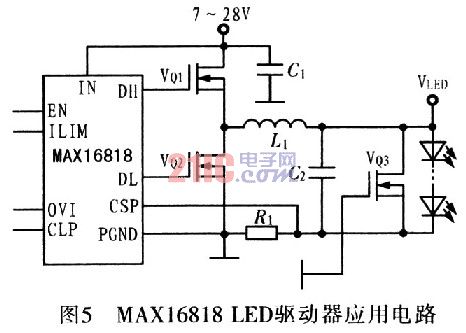 需要較高照明功率的場合,如泛光燈或霧燈,必須使用超高亮度LED(HBLED)。HBLED需要較高的驅(qū)動(dòng)電流,前面討論的產(chǎn)品無法提供低成本設(shè)計(jì),需要過多的驅(qū)動(dòng)器產(chǎn)生所需的電流。最好采用能驅(qū)動(dòng)大電流功率管的控制器,大電流功率管可以為HBLED提供高達(dá)30A的電流,MAXl6818可以滿足這種設(shè)計(jì)要求,如圖5所示。