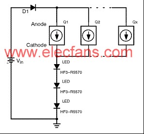 采用固定電壓電源供電的電阻是最簡單、最低成本的穩(wěn)流方法。實(shí)際上,它們并不穩(wěn)流,只是在LED正向電壓變化及源電壓變化并導(dǎo)致電流變化從而引起亮度變異時,簡單地限制最大電流。對于低電流指示器應(yīng)用而言,這可能可以接受,但隨著電流增大及串聯(lián)的LED數(shù)量增加,就變得有問題了。要克服這個問題,需要費(fèi)錢又費(fèi)時地對LED進(jìn)行編碼及選擇恰當(dāng)?shù)碾娮鑱砥ヅ銵ED串正向電壓。即使采取這些步驟,仍然會有由輸入電壓變化導(dǎo)致的亮度變化問題。