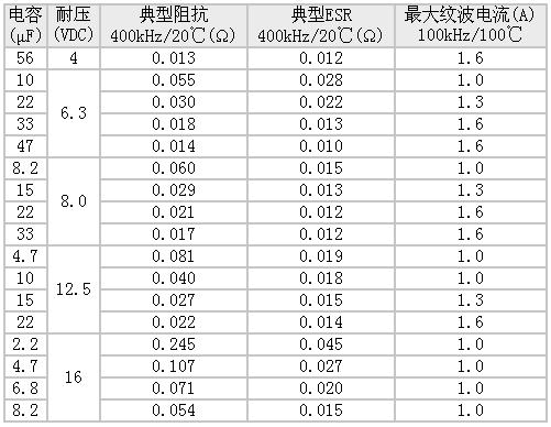 ESRD及ESRE兩個(gè)系列的電解電容具有極好的高頻特性,允許大的紋波電流,電容量允差±20%(精度為M級(jí)),等效串聯(lián)電阻ESR小,ESRD電容在100kHz時(shí)為10~45mΩ,ESRE電容在100kHz時(shí)低于10mΩ,400kHz、20℃時(shí)的阻抗為13mΩ到81mΩ,在使用溫度范圍內(nèi)阻抗幾乎不變,工作壽命長(zhǎng),小尺寸貼片式封裝,ESRD的尺寸為7.3mm(長(zhǎng))×4.3mm(寬)×1.8mm(高),而ESER系列的尺寸僅高度尺寸不同,高度為4.2mm,工作溫度為-55℃~+105℃。