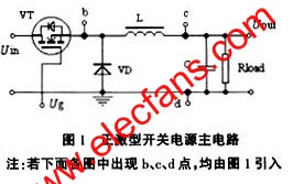一般來講,正激型開關(guān)電源主電路可用圖1所示的降壓斬波器簡化表示,Ug表示控制電路的PWM輸出驅(qū)動信號。根據(jù)選用不同的PWM反饋控制模式,電路中的輸入電壓Uin、輸出電壓Uout、開關(guān)器件電流(由b點(diǎn)引出)、電感電流(由c點(diǎn)引出或d點(diǎn)引出)均可作為取樣控制信號。