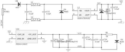 本控制模塊的電源電路如圖2所示。車載蓄電池—發(fā)電機的電源從24V_1處進入,二極管D16主要是防止電源的正負極被誤接反。電感L1、L2對電源進行濾波,和共模電感L3、電容C8配合,可以過濾掉電源中的尖峰脈沖。二極管D24P6KE51A是脈沖干擾抑制器(TVS),它可以快速吸收超過額定電壓的尖峰脈沖,瞬時通過電流很大,最大功率可達500~1000W。電容E5和C9進一步對電源進行濾波。過濾干凈的電流通過開關電源芯片LM2576變換為系統使用的5V電源。電容E7和C11對輸出5V電源進行濾波,電阻R18和發(fā)光二極管D28指示當前是否有電。
