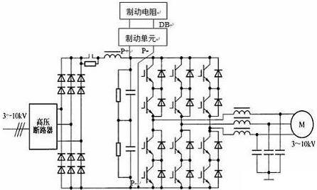 圖2.具有直流放電制動(dòng)裝置的IGBT直接串聯(lián)高壓變頻器主電路圖