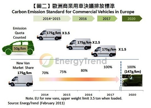 歐洲國(guó)會(huì)發(fā)布最新的商用車車輛排放標(biāo)準(zhǔn)決議,針對(duì)在載重能力為3.5噸的車輛,未來(lái)車廠所生產(chǎn)的車輛中,70%的數(shù)量須符合175g/km的排放標(biāo)準(zhǔn),而2017年平均比例更須達(dá)到100%。無(wú)法達(dá)到要求的汽車制造商,2019年開(kāi)始將被要求繳交每單位金額$129/g的增額排放罰款。另外,生產(chǎn)排放低于50g/km的車輛,也將能夠回饋車廠在高排放車種的緩沖額度。