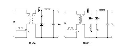 在圖3(a)所示的正激電源電路中,當(dāng)初級(jí)功率管V1開(kāi)始導(dǎo)通,次級(jí)整流二極管D1開(kāi)始導(dǎo)通,D2開(kāi)始截止時(shí),由于二極管PN結(jié)的電荷存儲(chǔ)效應(yīng),D2中流過(guò)了電流變化率di/dt很大的反向恢復(fù)尖峰電流i,致使V1、D1中也有相應(yīng)的尖峰電流流過(guò),在漏感、線電感等因素的共同作用下會(huì)在電源輸出端產(chǎn)生高頻的導(dǎo)通噪聲。在D2上施加的反向電壓越大,D2的反向恢復(fù)時(shí)間越長(zhǎng),反向恢復(fù)電流變化率di/dt就越大,電源輸出噪聲也就越大。大的反向恢復(fù)尖峰電流,不僅會(huì)產(chǎn)生電源噪聲,也容易損壞整流器件。