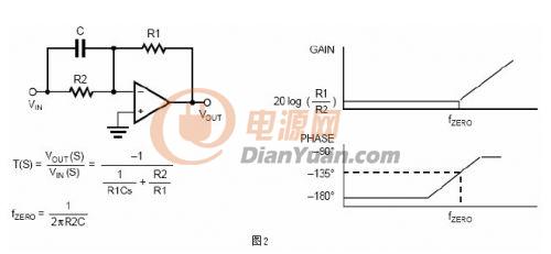 零點是頻域范圍內(nèi)的傳輸函數(shù)當分子等于零時產(chǎn)生的。在博得圖中,零點發(fā)生在增益以20dB每十倍頻的斜率開始遞增的點,并伴隨有90度的相位超前。圖2描述一個由高通濾波器電路引起的零點。