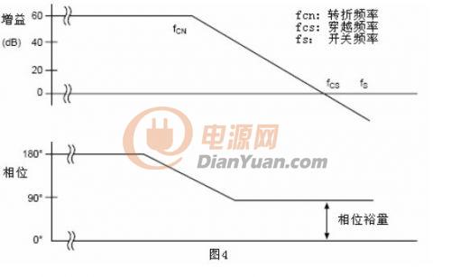增益帶寬是指單位增益時的頻率,見圖4,增益帶寬就是穿越頻率Fcs。最大穿越頻率的主要限制因素是電源的開關頻率。根據(jù)采樣定理,如果采樣頻率小于2倍信號頻率(更嚴謹一點的說法是應該小于2倍最大信號頻率,譯注),則被采樣的信息就不能被完全讀取。