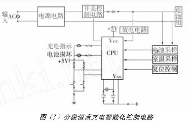 分段恒流充電智能化控制電路如圖(3)所示。該電路采用 CPU 控制,可對(duì)充電電池和充電環(huán)境溫度進(jìn)行檢測(cè),對(duì)電池充電進(jìn)行計(jì)時(shí),采用充電過(guò)程中電池的電壓和電流,對(duì)分段恒流充電過(guò)程進(jìn)行控制。