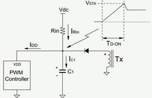起動電路損耗在電源轉(zhuǎn)換器空載待機損耗中占很高的比例,此處我們介紹一種起動速度快且損耗低的起動電路。圖6(a)為傳統(tǒng)起動電路,其中VSTA是脈寬調(diào)制控制器起始臨界電壓,TD_ON是啟動延遲時間,TD_ON=(C1×VSTA)/IC1。使用較大輸入電阻(Rin)可以有效降低電阻損耗,但啟動延遲時間會延長。因此建議采用圖6(b)電路,其中C1電容較小,這樣在用大輸入電阻時能夠降低起動電路的損耗,同時仍然擁有較快起動速度。較大的C2電容可提供穩(wěn)定的電壓給控制器使用,不會增加起動延遲時間。