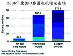步進(jìn)運動市場的總體規(guī)模,包括商業(yè)和汽車行業(yè)是相當(dāng)大的。據(jù)motiontechtrends(mtt)最新的市場研究,核心工業(yè)部門,工廠自動化(fa),代表了一個相對小的但是穩(wěn)固的市場,2006年在北美,步進(jìn)電機和控制消費大約為156萬美元。fa市場包括機床,機器人系統(tǒng),各種oem的生產(chǎn)機器(包括半導(dǎo)體設(shè)備、印刷、紡織、塑膠等)。據(jù)mtt粗略估計,歐洲和日本分別占步進(jìn)電機市場的15%和50%,高于美國。