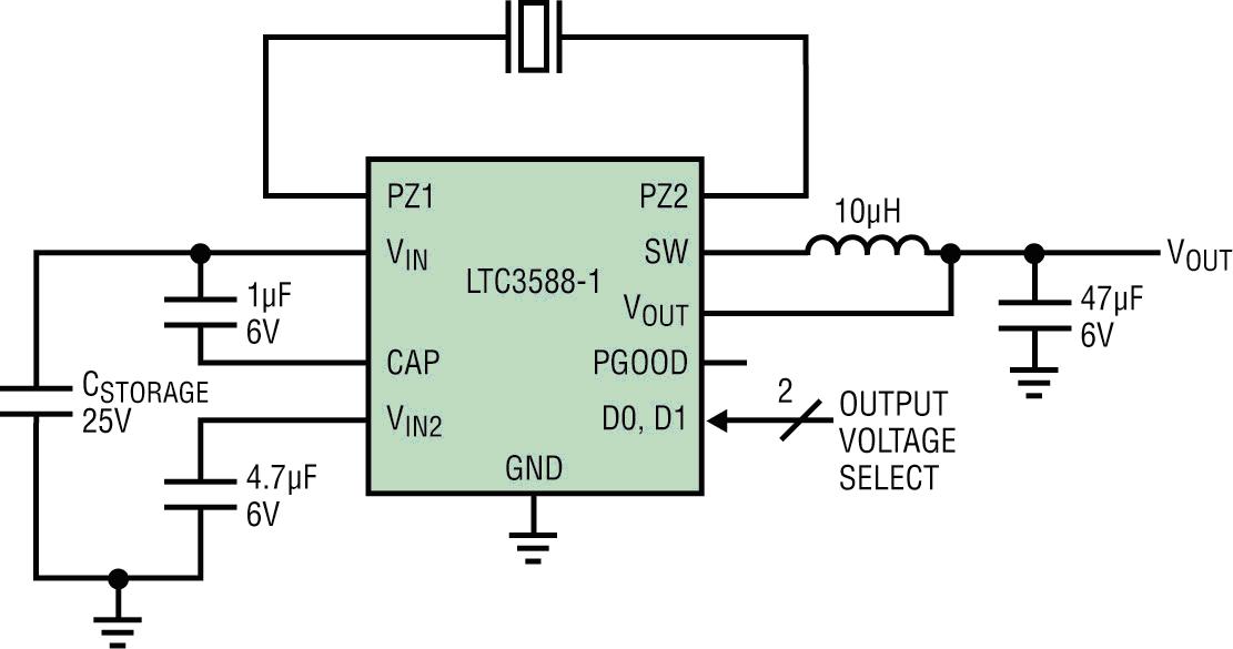 LTC3588-1 在 2.7V 至 20V 的輸入電壓范圍內(nèi)工作,從而非常適用于多種壓電傳感器及其他的高輸出阻抗能量源。其高效率降壓型 DC/DC 轉(zhuǎn)換器可提供高達 100mA 的連續(xù)輸出電流或者甚至更高的脈沖負(fù)載。其輸出可以設(shè)定為 4 種固定電壓之一 (1.8V、2.5V、3.3V 或 3.6V),以向無線發(fā)送器或傳感器供電。輸出處于穩(wěn)定狀態(tài) (無負(fù)載) 時,靜態(tài)電流僅為 950nA,從而最大限度地提高了總體效率。