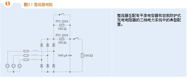 [page]上述電路采用三相橋式整流器,并將其接至相導(dǎo)線電壓為400 VRMS的電源中。其中平滑電容器的電容為940 μF。并聯(lián)電路含有兩個(gè)B59204J0130B010型充電電阻器,用于限定沖擊電流。亦稱為零電位電阻器,其額定電阻在25℃的環(huán)境溫度下為100 ?。在這種情況下,需要并聯(lián)兩元件:因?yàn)殡娔鼙仨氃诔潆娖陂g內(nèi)傳到電容器,這會使單個(gè)B59204J0130B010電阻器開始發(fā)熱,直至溫度高出允許范圍,結(jié)果便導(dǎo)致電阻大大加強(qiáng)。這一情況應(yīng)當(dāng)避免,否則將無法對鏈路電容器進(jìn)行徹底充電。