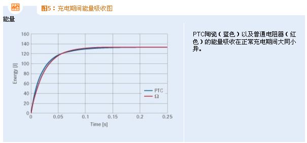 在短時(shí)間內(nèi),并聯(lián)的兩個(gè)自我防護(hù)式充電電阻器與外界達(dá)到熱平衡,同時(shí)由于PTC陶瓷的高電阻值,吸收的能量僅有略微上升。最終產(chǎn)生的能量吸收與圖7所示類似。