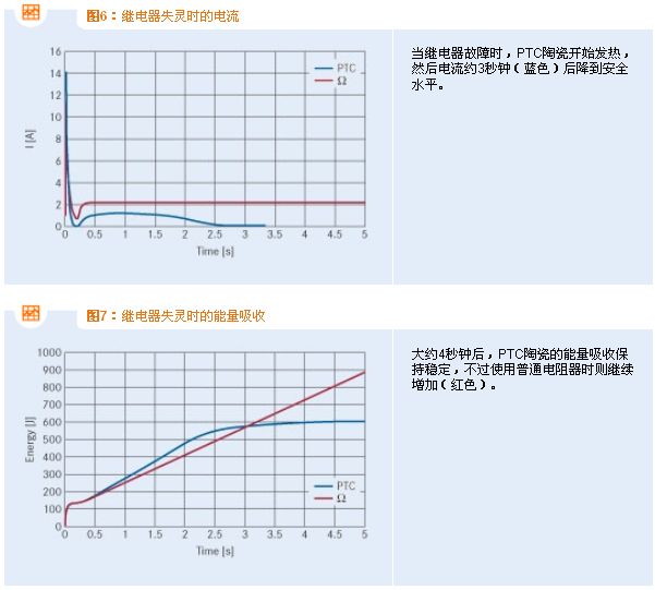 當(dāng)發(fā)生故障時(shí),PTC熱敏電阻用作限流元件的優(yōu)勢就會十分明顯。如果繼電器接通失敗,負(fù)荷電流將流經(jīng)充電電阻器,并產(chǎn)生強(qiáng)大的熱應(yīng)力,這要求電阻器有相應(yīng)的尺寸。若采用基于PTC陶瓷的充電電阻器,其電阻會由于強(qiáng)大的起始功率損耗而升至數(shù)10 k,從而能夠在故障發(fā)生期間限定電流(參見圖6)。在約三秒之后,先流經(jīng)兩電阻器然后流經(jīng)總體電路的電流已跌至數(shù)10 mA。有關(guān)吸取能量的比較,請參見圖7。