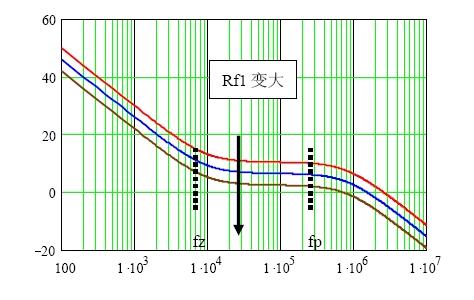 因此,當(dāng)補(bǔ)償網(wǎng)絡(luò)進(jìn)入系統(tǒng)環(huán)路之后,Rf1的作用是使環(huán)路增益的幅頻特性上下平移,同時環(huán)路增益的相頻特性保持不變。