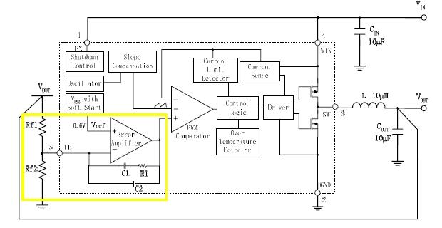 對于不同廠商設(shè)計的Buck變換器芯片,外圍電路所需要的器件會有所不同,這是因?yàn)樾酒募啥扔胁町?,比如,有的廠商會把功率管集成在芯片內(nèi)部;有的廠商會把控制部分的補(bǔ)償網(wǎng)絡(luò)集成在芯片內(nèi)部。集成度越高的芯片,外圍電路所需要的器件就越少,因此對于客戶來說,外圍器件的選擇需要根據(jù)具體芯片來決定。然而,對于任何一個輸出可以調(diào)節(jié)的Buck變換器芯片,選擇合適的反饋電阻是必不可少的。圖2是BCD半導(dǎo)體公司的Buck變換器AP3406的典型應(yīng)用圖,由于該芯片集成度很高,外圍只需要輸入電容、輸出電感、輸出電容和反饋電阻,本文就以此為例對反饋電阻的作用做簡要分析,為如何選擇反饋電阻提供參考。
