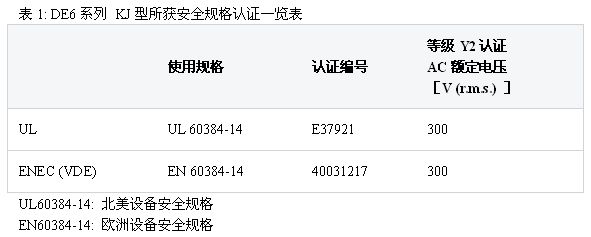 要想獲得安全規(guī)格認(rèn)證,需要接受規(guī)定的實(shí)驗(yàn)并滿足要求標(biāo)準(zhǔn),通過合格判定,才能夠證明電容器符合該規(guī)格。但目前,對(duì)On-Board(含車載充電器的車載設(shè)備)的安全規(guī)格并無明確規(guī)定。實(shí)際上,車載充電器已經(jīng)參照現(xiàn)有民用設(shè)備的安全規(guī)格,決定了其規(guī)格發(fā)展方向并付諸實(shí)施。因此,該電容器在遵循現(xiàn)有的設(shè)備安全規(guī)格(IEC 60384-4)的基礎(chǔ)上,也獲得了各國的安全規(guī)格認(rèn)證。DE6系列“KJ”型所獲得的安全規(guī)格認(rèn)證如下表1所示。