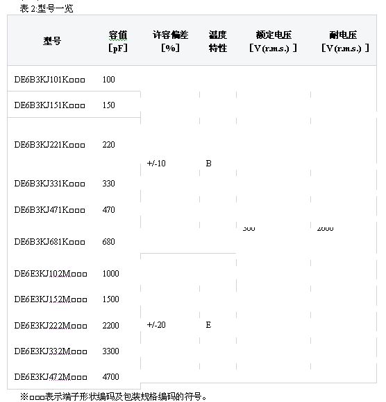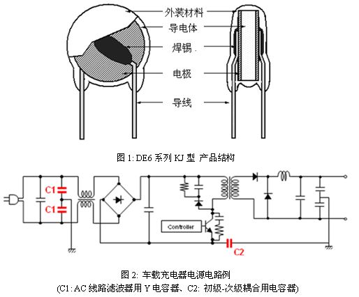 產(chǎn)品線如表2所示,產(chǎn)品結(jié)構(gòu)如圖1所示。產(chǎn)品的容值從100pF到4700pF,另外,額定電壓為AC300V (r.m.s.) 、耐電壓為AC2600V (r.m.s.) /60sec。滿足IEC 60384-14所規(guī)定的實(shí)驗(yàn)條件,通過新樹脂材料的絕緣涂裝,提高了耐溫度循環(huán)特性,能夠成為PHEV以及EV的車載充電器的AC線路濾波器用Y電容器、初級(jí)次級(jí)耦合用電容器,如圖2所示。