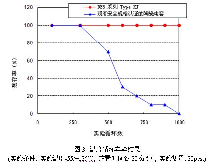 現(xiàn)有安全規(guī)格認(rèn)證的陶瓷電容器在溫度循環(huán)實(shí)驗(yàn)等反復(fù)進(jìn)行溫度變化的條件下,因電容器構(gòu)成材料熱膨脹率的散差,容易引起外部涂裝樹脂的結(jié)合力降低,從而導(dǎo)致外部涂裝樹脂出現(xiàn)裂縫,嚴(yán)重時(shí)會(huì)由于內(nèi)部陶瓷元器件的裂縫,造成容值及絕緣耐壓值的降低。所以,原樣采用現(xiàn)有結(jié)構(gòu)材料將難以用于車載設(shè)備。因此,為提高耐溫度循環(huán)性,通過選定具備可塑性的新型樹脂材料,就能夠制做出確保溫度循環(huán)1000周期、符合安全規(guī)格認(rèn)證的陶瓷電容器。溫度循環(huán)實(shí)驗(yàn)下的產(chǎn)品特性比較情況如圖3所示。