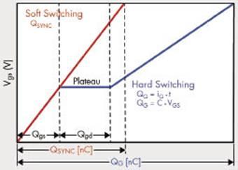 利用已知的電阻值,可通過下式求得QSYNC,這樣就可以更準(zhǔn)確地估算出柵極驅(qū)動功耗。同步整流中,QSYNC較小,器件的性能也較好。如圖7所示,同步整流的功率MOSFFET的柵-源電壓上無平坦區(qū)。