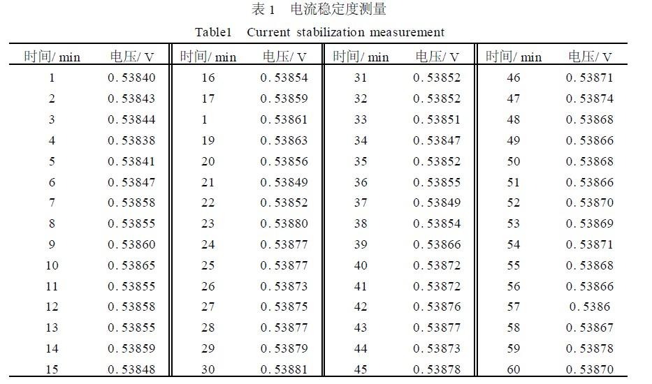 驅(qū)動(dòng)電源一個(gè)重要技術(shù)參數(shù)為電流穩(wěn)定度。電流穩(wěn)定度是在一定時(shí)間內(nèi),多次測(cè)量通過(guò)負(fù)載的電流大小,然后通過(guò)數(shù)學(xué)計(jì)算得出輸出電流穩(wěn)定度大小。實(shí)驗(yàn)中每間隔一分鐘測(cè)量一次,測(cè)量時(shí)間持續(xù)一個(gè)小時(shí)。測(cè)量時(shí),用1.2Ω50W電阻作為模擬負(fù)載,測(cè)量模擬負(fù)載的兩端電壓,用模擬負(fù)載兩端電壓穩(wěn)定性來(lái)標(biāo)定電流穩(wěn)定性。測(cè)量?jī)x器為:電壓測(cè)量?jī)x器:Agilent34401A61/2digitmultime2ter,其精度可以達(dá)到0.00001V;供電電源為Agi2lentE3631AtripleoutputDCpowersupply12V,1A。電流穩(wěn)定度實(shí)驗(yàn)數(shù)據(jù)如表1所示。