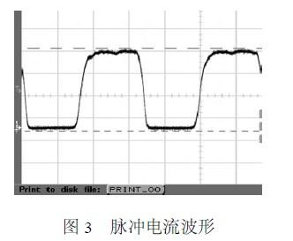 此保護(hù)電路已經(jīng)應(yīng)用于實(shí)踐,由于限流措施穩(wěn)定可靠,半導(dǎo)體激光器的使用壽命得到了保證。利用功率器件的開(kāi)通與關(guān)斷強(qiáng)制吸收和隔離浪涌沖擊,使得在脈沖工作狀態(tài)下的浪涌沖擊也被很好地抑制,圖3是電源工作在脈沖狀態(tài)下,負(fù)載實(shí)際的電壓波形。
