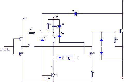 正常工作時,因故障檢測二極管VD1的導通,將a點的電壓鉗位在穩(wěn)壓二極管VZ1的擊穿電壓以下,晶體管VT1始終保持截止狀態(tài)。當電路發(fā)生過流或短路故障時,V1上的uce上升,a電壓隨之上升,到一定值時,VZ1擊穿,VT1通,b點電壓下降,電容C1通過電阻R1充電,電容電壓從零開始上升,當電容電壓上升約1.4V時,晶體管VT2開通,柵極電壓uge隨電容電壓的上升而下降,通過調(diào)節(jié)C1的數(shù)值,可控制電容的充電速度,進而控制uge的下降速度;當電容電壓上升到穩(wěn)壓二極管VZ2的擊穿電壓時,VZ2擊穿,uge被鉗位在一固定的數(shù)值上,慢降柵壓過程結(jié)束,同時驅(qū)動電路通過光耦輸出過流信號傳送至單片機,此時單片機發(fā)出聲光報警并開始運行延時程序。如果在單片機的延時過程中,故障信號消失了,則a點電壓降低, VT1恢復載止,C1通過R2放電,d點電壓升高,VT2也恢復截止,uge上升,電路恢復正常工作狀態(tài),單片機自動進行復位。如果單片機在延時結(jié)束后,故障信號仍存在則由單片機切斷所有IGBT的輸入脈沖,設(shè)備停止工作,此時要通過手動復位才能恢復正常工作。這種電路既能保護逆變電路和IGBT的安全,又不會在瞬時過流時中斷逆變電源工作所以是一種非常有效的保護方式。