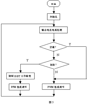 在此硬件電路的基礎(chǔ)上,結(jié)合單片機的控制系統(tǒng)可檢測輸出電壓低于某一設(shè)定值時,單片機便認為負載電弧是處于短路狀態(tài),這時單片機便對IGBT的最小脈沖寬度進行限制,以保證吸收電容有足夠的放電時間,從而降低IGBT的關(guān)斷反向電壓。同時為保證輸出電流恒定,單片機在判斷輸出為短路時將逆變器的等脈沖寬度調(diào)節(jié)(PWM)變?yōu)轭l率調(diào)節(jié)控制(PFM),即脈沖分頻控制,輸出電壓越低,輸出脈沖的頻率越低。其單片機程序過程如圖5所示: