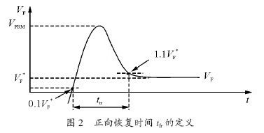 由整流二極管的國際標(biāo)準(zhǔn)知,正向恢復(fù)時間tfr 規(guī)定為:在緊接零電壓或其他規(guī)定的反向電壓條件施加規(guī)定的階躍正向電流時,正向電壓上升到第一個規(guī)定值瞬間和從其峰值VFRM 下降到接近正向電壓最終穩(wěn)定值的第二個規(guī)定值瞬間的時間間隔。如圖2 所示。