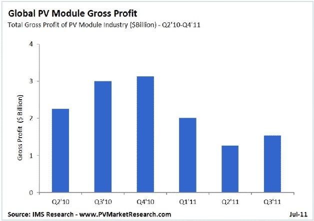 2010年,全球光伏組件供應(yīng)商每季度的總毛利率平均約為25億美元,而由于利潤(rùn)率下降以及出貨量減少,預(yù)計(jì)2011年第一季和第二季這個(gè)數(shù)字將下降40%。預(yù)計(jì)2011年下半年需求將再次回升,這將有助于供應(yīng)商恢復(fù)利潤(rùn)。IMS Research預(yù)計(jì)光伏組件供應(yīng)商的總毛利率在2011年第三季和第四季將再次增長(zhǎng)。