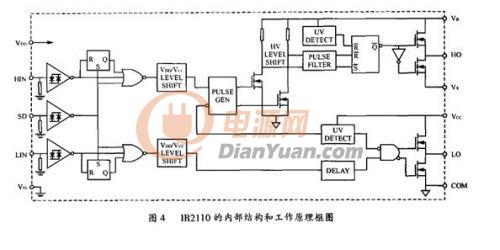 IR2110的內(nèi)部結(jié)構(gòu)和工作原理框圖如圖4所示。圖中HIN和LIN為逆變橋中同一橋臂上下兩個(gè)功率MOS的驅(qū)動(dòng)脈沖信號(hào)輸入端。SD為保護(hù)信號(hào)輸入端,當(dāng)該腳接高電平時(shí),IR2110的輸出信號(hào)全被封鎖,其對(duì)應(yīng)的輸出端恒為低電平;而當(dāng)該腳接低電平時(shí),IR2110的輸出信號(hào)跟隨HIN和LIN而變化,在實(shí)際電路里,該端接用戶(hù)的保護(hù)電路的輸出。HO和LO是兩路驅(qū)動(dòng)信號(hào)輸出端,驅(qū)動(dòng)同一橋臂的MOSFET