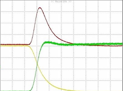 開(kāi)關(guān)損耗其實(shí)也是一個(gè)很重要的指標(biāo)。從下圖可以看到,導(dǎo)通瞬間的電壓電流乘積相當(dāng)大。一定程度上決定了器件的開(kāi)關(guān)性能。不過(guò),如果系統(tǒng)對(duì)開(kāi)關(guān)性能要求比較高,可以選擇柵極電荷QG比較小的功率MOSFET。