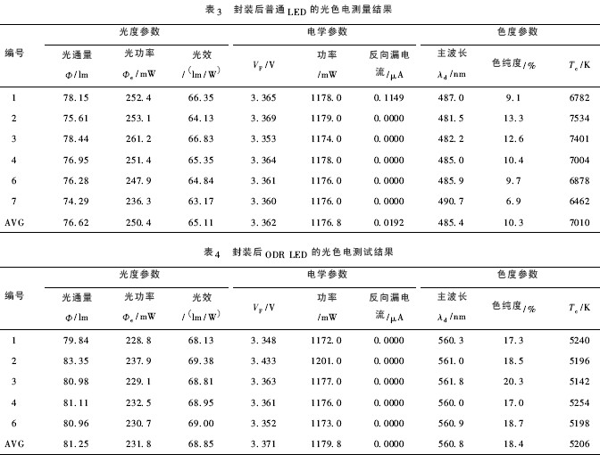 對封裝后的樣品選取普通LED 和ODR LED 各7個,兩類LED中不同樣品各自編號,先進(jìn)行LED的快速光色電測試,測試儀器為杭州遠(yuǎn)方HAAS- 2000 LED 快速光色電綜合測試量系統(tǒng),測試溫度為25℃,測試電流為350 mA,兩組LED 的測試結(jié)果如下,表3 中去除5 號、表4 中去除5 號和7 號等性能不佳的樣品,兩組樣品測量反向漏電流時的反向電壓均為- 5. 008 V.