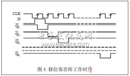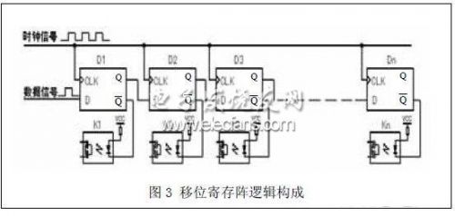 移位寄存陣是由D 觸發(fā)器串聯(lián)構(gòu)成的,它與光電繼電器一起構(gòu)成選通電路。圖3 中,D1,D2,……Dn 表示的是D 觸發(fā)器,每個D 觸發(fā)器的輸出Q 是下一個D 觸發(fā)器的數(shù)據(jù)信號,所有的D 觸發(fā)器由相同的時鐘信號控制。D 觸發(fā)器的反碼輸出Q 用來控制對應(yīng)的光電繼電器的通斷,當(dāng)Q 為高電平時光電繼電器斷開,當(dāng)Q 為低電平時光電繼電器導(dǎo)通。通過控制第一個D 觸發(fā)器的數(shù)據(jù)信號,可實(shí)現(xiàn)D1,D2,……Dn 的Q 逐個輸出低電平即移位功能,從而控制光電繼電器K1,K2,……Kn按順序的逐個單獨(dú)閉合,實(shí)現(xiàn)通道選通功能。