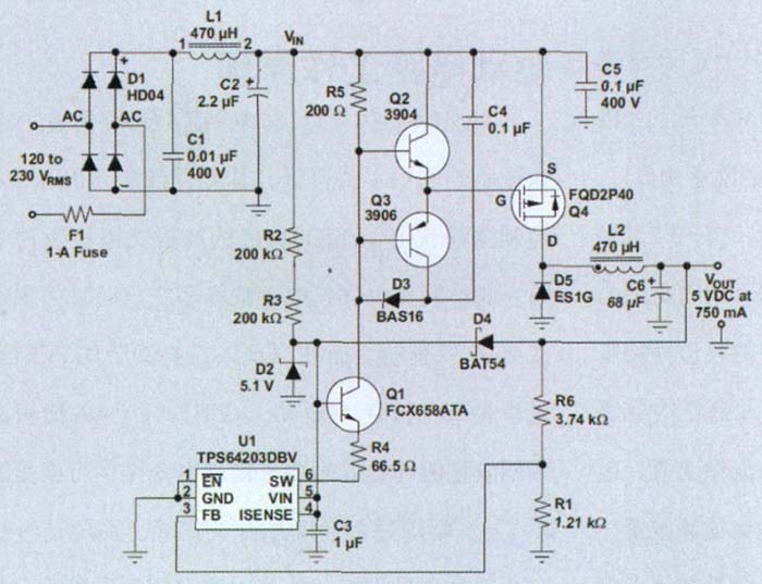 FQD2P40相對(duì)較新,即400V P通道MOSFET。利用10V柵極驅(qū)動(dòng)的5.0Ω RDS(on) 以及小于13nC的總選通電極充電,借助于由Q2、Q3、C4和D3組成的創(chuàng)新驅(qū)動(dòng)電路,該FET可輕松地通過(guò)控制器開(kāi)關(guān)擁有比老式FET相對(duì)更少的導(dǎo)電和開(kāi)關(guān)損耗。我們選擇轉(zhuǎn)換器的整流肖特基二極管D5,因?yàn)樗鼡碛锌勺柚馆斎腚妷旱碾妷侯~定值、稍高于輸出電壓的峰值電流額定值,以及IDiode(Avg) =(1 – D) × IOUT(max)的平均電流額定值。利用Dmax 5 V/120 V = 0.04 以及如此低的輸出功率,峰值電流額定值和功耗在兩種開(kāi)關(guān)中都不成問(wèn)題。