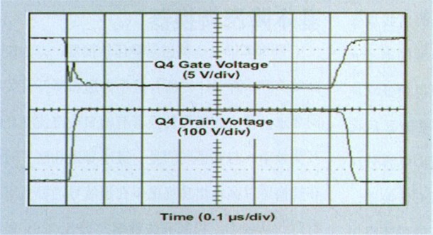 圖 3 一個(gè)開(kāi)關(guān)周期的Q4柵極和漏極電壓