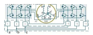 為了消除pwm電機驅動系統(tǒng)共模電流,a.consoli等學者基于共模電壓補償技術,提出了一種應用于由兩個或多個功率變換器組成的多驅動系統(tǒng)公共直流母線共模電流消除技術,拓撲結構見圖6所示。該方法是在兩個功率變換器做適當連接的基礎上,通過控制兩個變換器狀態(tài)序列而使共模電壓同步變化的新pwm調制策略。