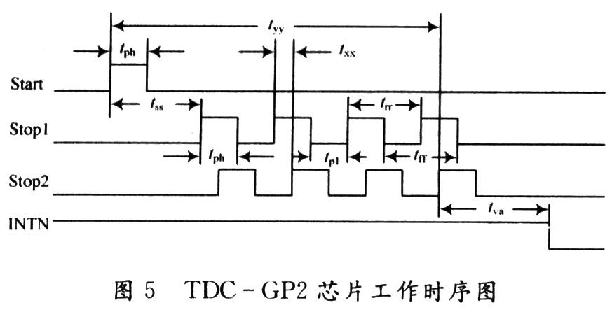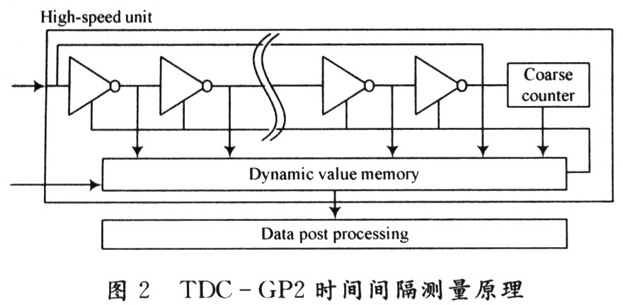 該系統(tǒng)主要由脈沖產(chǎn)生器、數(shù)據(jù)處理單元、時(shí)間數(shù)字轉(zhuǎn)換器、溫度測(cè)量單元、時(shí)鐘控制單元、配置寄存器以及與單片機(jī)相接的SPI接口組成。在實(shí)際應(yīng)用中,由于TDC-GP2的功耗很低,使得TDC-GP2的輸入/輸出電壓(工作電壓)為1.8~5.5 V,核心電壓為1.8~3.6 V,所以可以采用電池供電,使用方便。同時(shí)單片機(jī)由4線的SPI接口相連,可以把TDC-GP2作為單片機(jī)的一個(gè)外圍設(shè)備來(lái)操作。通過(guò)內(nèi)部ALU單元計(jì)算出時(shí)間間隔,并將結(jié)果送入結(jié)果寄存器保存起來(lái)。通過(guò)對(duì)TDC-GP2內(nèi)部寄存器的設(shè)置,可以多次采樣并將結(jié)果保存。TDC-GP2是基于內(nèi)部的模擬電路測(cè)量“傳輸延時(shí)”來(lái)進(jìn)行的,是以信號(hào)通過(guò)內(nèi)部門(mén)電路的傳播延遲來(lái)進(jìn)行高精度時(shí)間間隔測(cè)量的。TDC-GP2時(shí)間間隔測(cè)量原理如圖2所示。