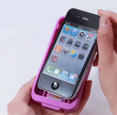 O`cellus的手機保護套會將你的手機包起來,咋一看,人們會把當成隨處可見的保護套,同時,在背后有四個金按三角形排列。這些金屬點可以和你的充電底板連在一起,這樣才能充電。當然,有人喜歡這個硬殼和金屬點,屬點,而有人不喜歡。O`cellus的充電板也特別薄,“金屬條”沿著充電板鋪在上面。邊緣高起的部分是電源接口和 LED 指示燈的位置,用來告訴你是否正在對其他設備進行充電。整個充電板很輕,你不會感覺到它的分量。