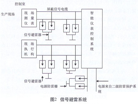 信號通道電涌器應(yīng)確保正常狀態(tài)下儀表各類檢測信息傳遞準確、穩(wěn)定、靈活,雷暴天氣又能將過壓電涌泄放到大地,鉗制輸出電壓在安全區(qū)域,從而確保信號傳輸?shù)陌踩氖褂眯Ч?,安裝電涌器防雷大大提高了雷暴天氣下智能儀表裝置的安全系數(shù)。信號避雷系統(tǒng)如圖2所示。