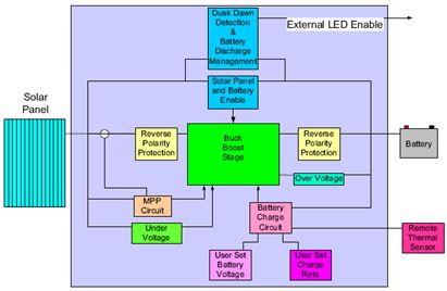 設計工作包括根據功率需求的增加隔離拓撲結構。電池充電狀態(tài)的管理是由適當的充電算法完成的。太陽能電池板安裝技師可以選擇輸出電壓和電池充電速率。由于控制器要連接到太陽能電池板,它必須具有最大功率點跟蹤,為最終客戶提供高價值??刂破饔袃蓚€正使能(Enable)電路,一個電路檢測黑夜時間,另一個檢測電池的充電狀態(tài),使外部電路不會使電池對損壞點放電。由于控制器將由不同程度經驗的現場技術人員和新手安裝,因此重要的是輸入和輸出必須有反向極性保護。另外,控制器和電池可能安裝在過熱或過冷的位置,控制器必須采用電池充電溫度補償。設計還應包括安全功能,如電池過壓檢測和太陽能電池板欠壓檢測。