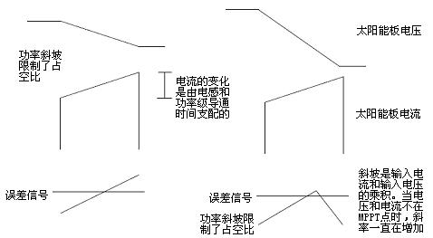 為了從功率可變的電源(即太陽能電池板)析取出最大的功率,太陽能控制器必須采用MPPT。MPPT必須首先找到最大功率點并及時調整環(huán)境條件,以保持控制器接近最大功率點。動態(tài)MPPT用在系統(tǒng)發(fā)生改變的情況下。由于每個開關周期都在發(fā)生變化,太陽能電池板汲取的功率也會在每個周期有明顯的改變。動態(tài)MPPT利用太陽能電池板的電壓驟降乘以每個開關周期增加的電流,以確定將要產生的誤差信號來調節(jié)占空比。動態(tài)響應可檢測IV曲線的斜率,從而建立一個功率斜坡,從誤差信號相交點建立一個代表占空比的功率。當斜坡變化斜率從正到負時該周期結束,如圖2所示。
