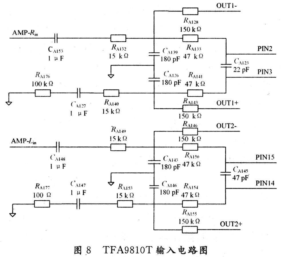TFA9810T輸入端采用可抑制共模干擾的全差分輸入電路。以圖8 AMP-Rin輸入端為例,RA128/RA133/CA139構(gòu)成負(fù)反饋低通濾波器,用于衰減反饋信號(hào)中高頻載波成分。增加低頻成分反饋量,特別是直流成分。有效改善了零輸入時(shí)因輸入信號(hào)直流電平與比較器門限電壓差異形成的占空比誤差,調(diào)整RA128也可實(shí)現(xiàn)TFA9810T增益控制,使Au(dB)=20log(VOUT/VIN)≌20log(RA128/RA132)。器件CA153/RA132/RA133及TFA9810T內(nèi)阻構(gòu)成高通濾波器,用于對(duì)輸入信號(hào)的緩沖。若CA153容值過(guò)小,會(huì)影響低頻響應(yīng),理論確定公式為: