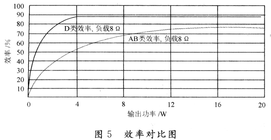 由上述公式得知,D類功放中負(fù)載RL,相對(duì)其他電阻,比值越大效率越高;MOSFET作為續(xù)流開關(guān),所消耗的功率幾乎等于MOSFET導(dǎo)通阻抗上I2RON損耗和靜態(tài)電流總和,相比較輸出到負(fù)載的功率幾乎可忽略。所以,其效率遠(yuǎn)高于線性功放,如圖5所示。非常適應(yīng)現(xiàn)今綠色節(jié)能的要求,適合被平板等數(shù)字視聽產(chǎn)品規(guī)模使用。