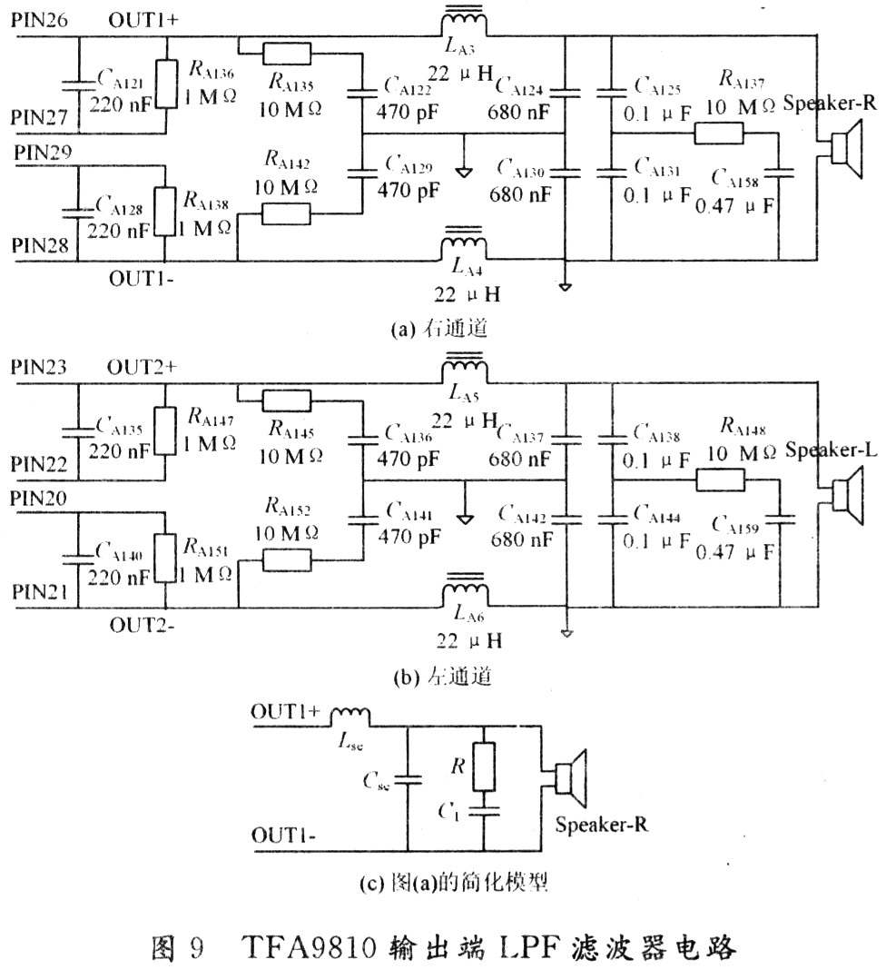 TFA9810T輸出端低通濾波器采用二階巴特沃思濾波器方式,實(shí)際的巴特沃思二階濾波器由圖9中RCA類電子元器件CA135/RA145/CA136/LA5/CA137/CA138/RA148/CA159/CA140/CA141/RA152/LA6/CA142/CA144等構(gòu)成,對(duì)PWM方波中15 Hz~20 kHz音頻成分表現(xiàn)為直通效應(yīng),對(duì)超過(guò)音頻范圍的20 kHz以上高頻成分呈現(xiàn)-12 dB/倍頻程滾降率。